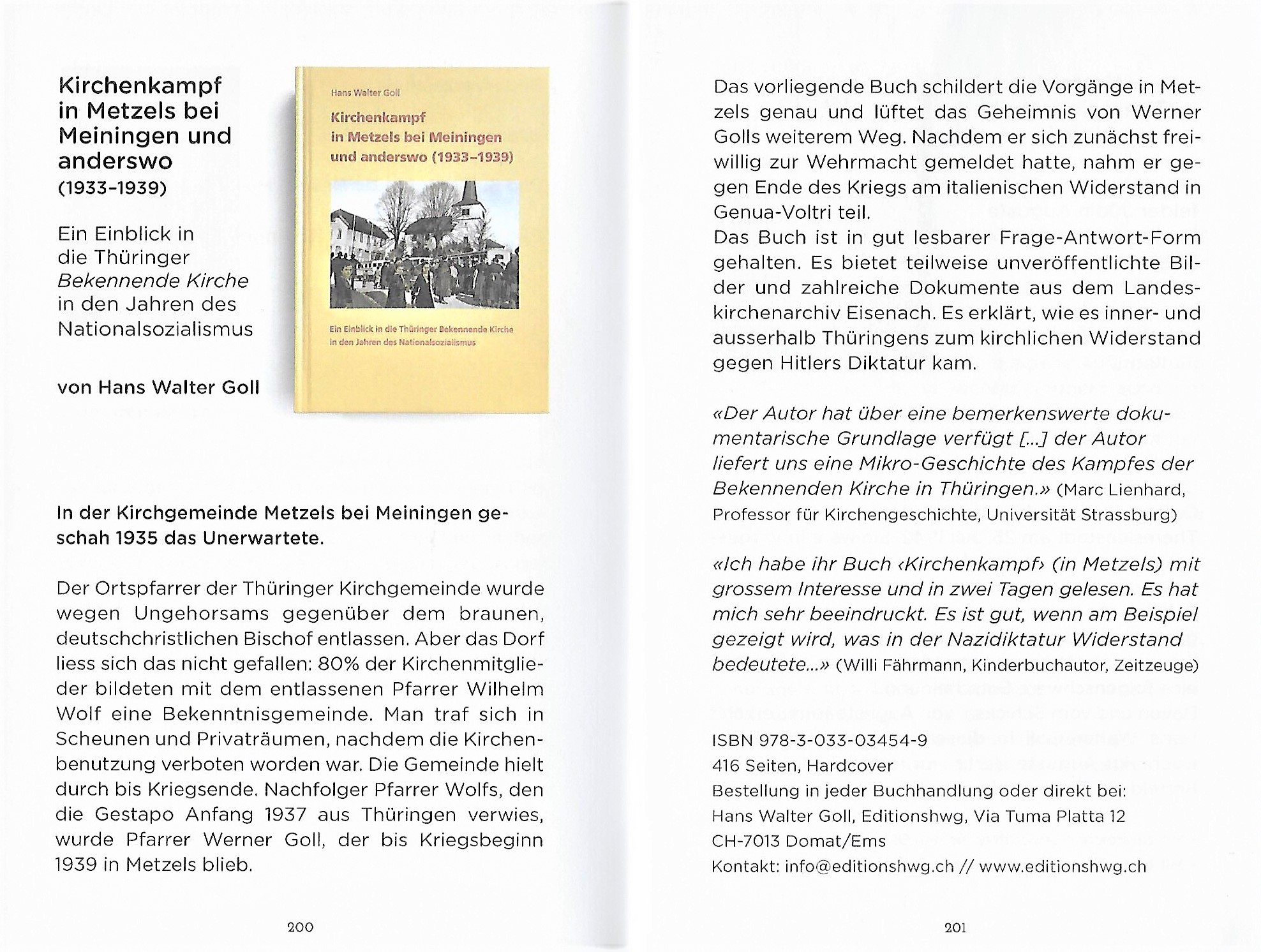Das Buch über den Kirchenkampf in Metzels und anderswo erzählt die bisher wenig erforschte Geschichte der beteiligten Personen und ordnet sie auf verständliche Weise historisch ein. Pfarrer Werner Goll, einer der Pfarrer der Bekenntnisgemeinde, war der Vater des Autors.